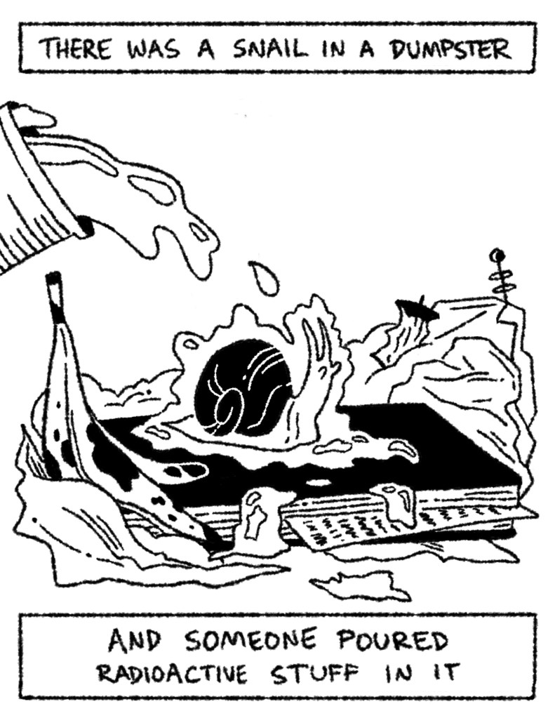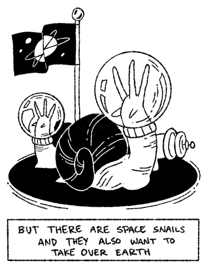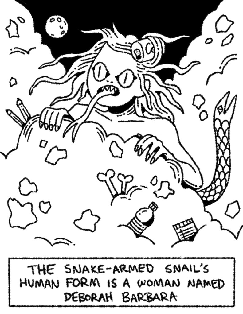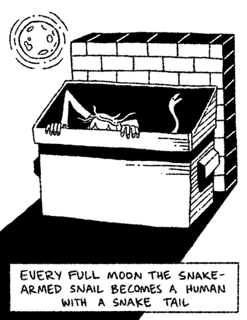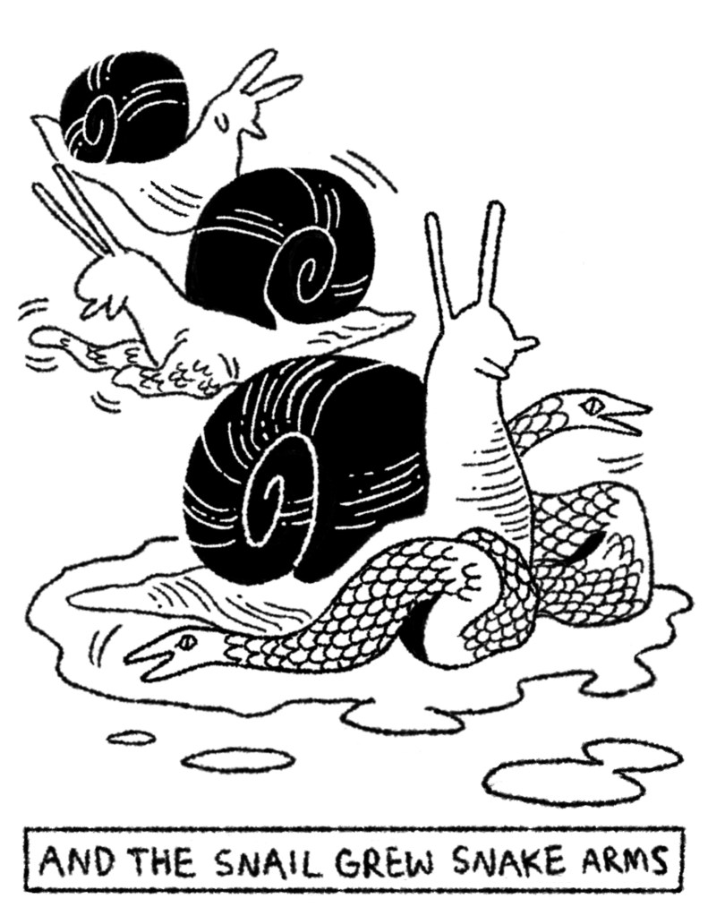 The Snake-Armed Snail, created for the comics anthology Wipeout 6 for the Providence Comics Consortium. The text of this comic was written entirely by kids at Providence, RI’s Mt. Pleasant Library.